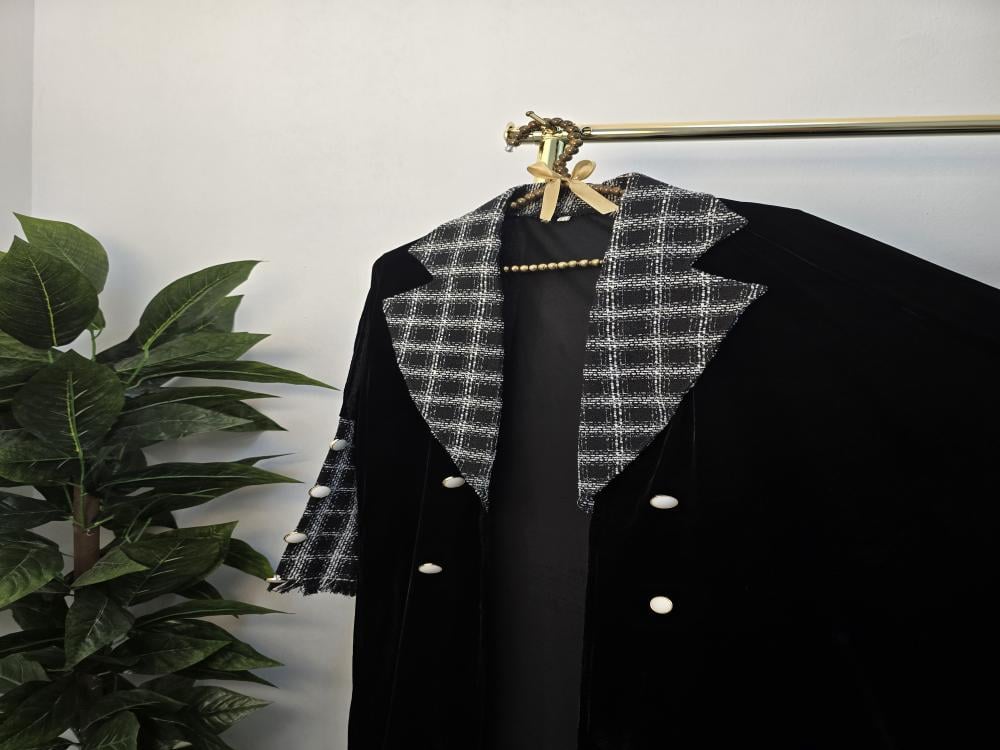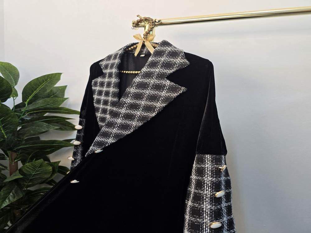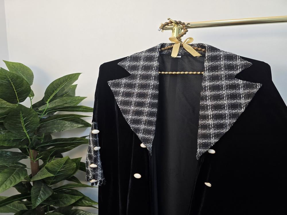 عباية شتوية فخمة من عبايات صبايا ستايل، مصمّمة من قماش مخمل كوري فاخر يضفي دفئاً وأناقة في الشتاء، ومزيّنة بتفاصيل قماش شانيل ناعم يمنحها لمسة راقية وأنثوية. تصميم أنيق يجمع بين الفخامة والراحة، لتتميّزي بإطلالة شتوية راقية تواكب الموضة بكل تفاصيلها.