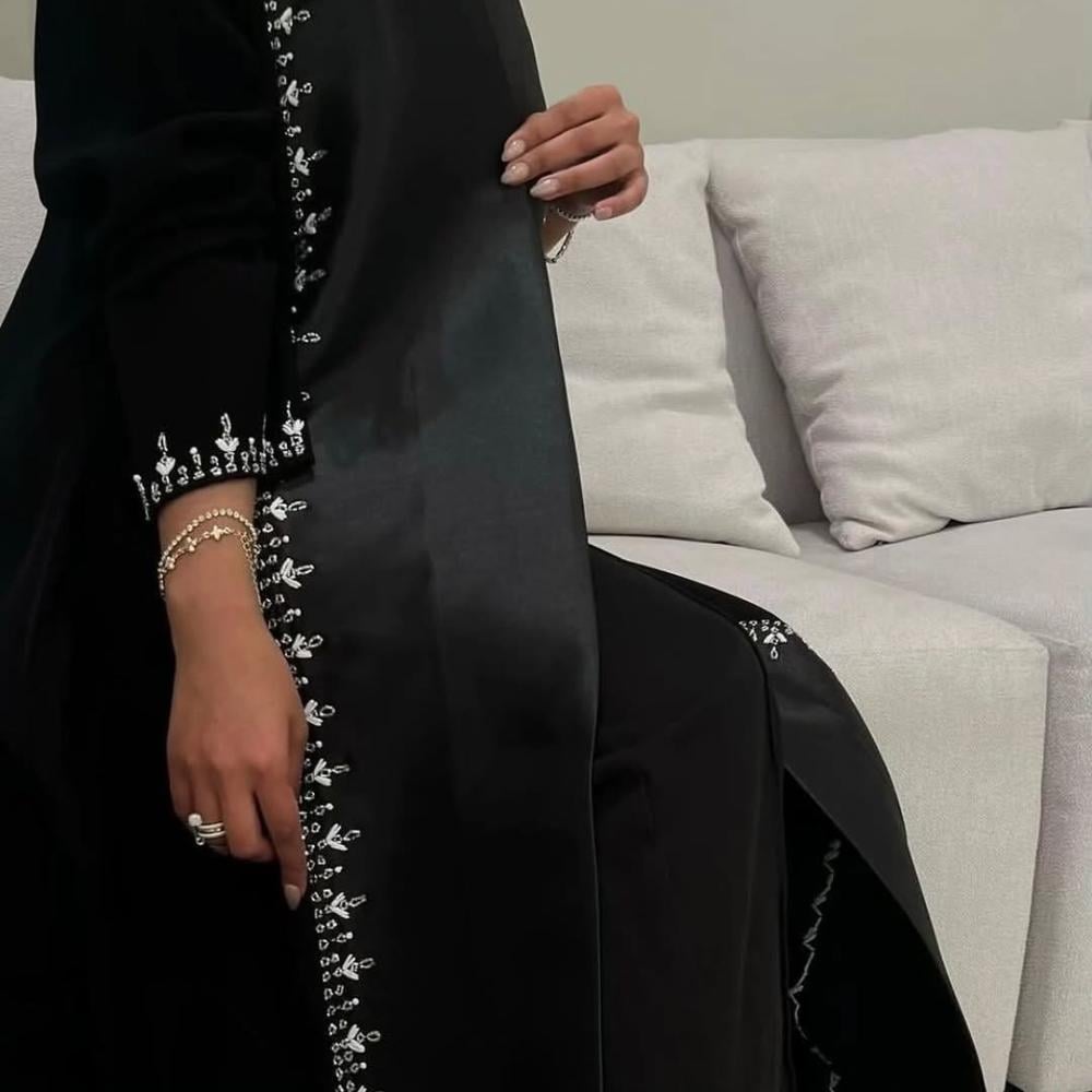 العباية مزينة بـ شك يدوي فضي مميز،